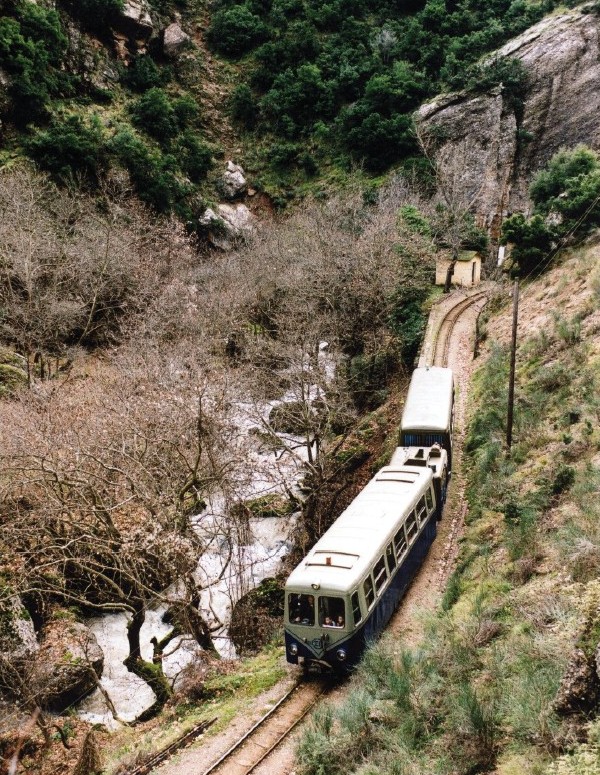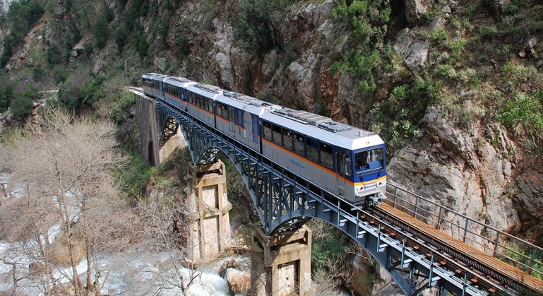 The Serrated or Rack Railway (Odontotos) that runs through the Vouraikos Gorge is one of the few rack railways in the world. It has a total length of 22,350 metres, including 3,400 metres of toothed (rack) sections. The maximum gradient on the adhesion (non-rack) sections is 33 o/oo, while on the rack sections, it reaches up to 175 o/oo. Access points to the Odontotos include the starting station in Diakopto, as well as the intermediate stations of Niamata, Triklia, Megalo Spilaio, and Kerpini, with the terminus located in Kalavryta.