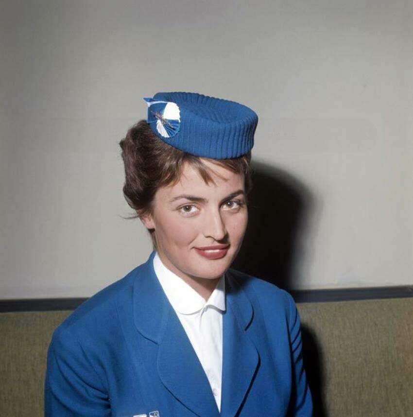 At the same time, the new formed company commissioned haute couture designer Jean Dessès (1904-1970) to create the first crew uniforms. Dessès (born Γιάννης Ντεσσές) was a talented Greek designer, born in Egypt, who settled in Paris at an early age. Active in the fashion industry from 1924, he opened his own haute couture house on Avenue George V in 1937. Widely regarded as one of the most important fashion designers of the 1940s to 1960, he was also the first to design uniforms for Olympic Airways. His design for the stewardesses and flight attendants referenced to the “New Look” style, introduced by Christian Dior (1905-1957) in 1947 –a style that, after the austerity of the WWII years, emphasised a return to decorative femininity. The OA uniform, used from 1957 to 1966, consisted of a tight-fitting, tailor-made suit featuring a narrow midriff jacket in a blue hue, paired with a white shirt and a blue pillbox hat.