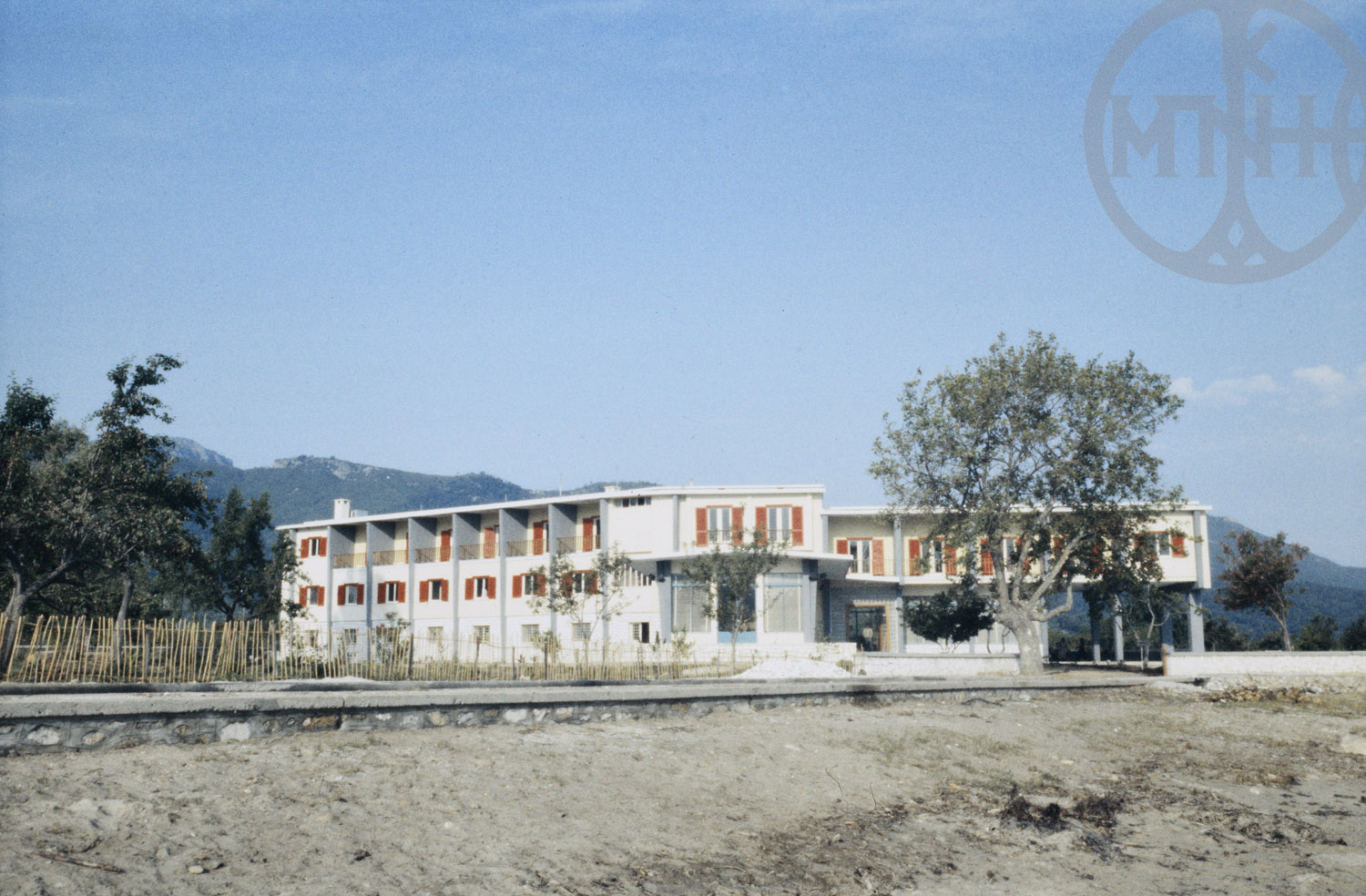 The Alkyon Xenia in Limenas is located at the western end of the port of the island of Thassos, on a plot of 3 acres, on an area of 1,425 sq.m. It was built in 1956, and had a capacity of 42 beds. It was designed by the architect Charalambos Sfaellos, who served as Director of Technical Services of the then newly established Greek Tourism Organisation between 1950 and 1958. Under his guidance, the design and construction of the Xenia Tourist Facilities Network throughout the country began. The building is an interesting and unusual example of post-war modern architecture of the 1950s, a transitional phase from pre-war purism to the post-war brutalism of the 1960s and 1970s.