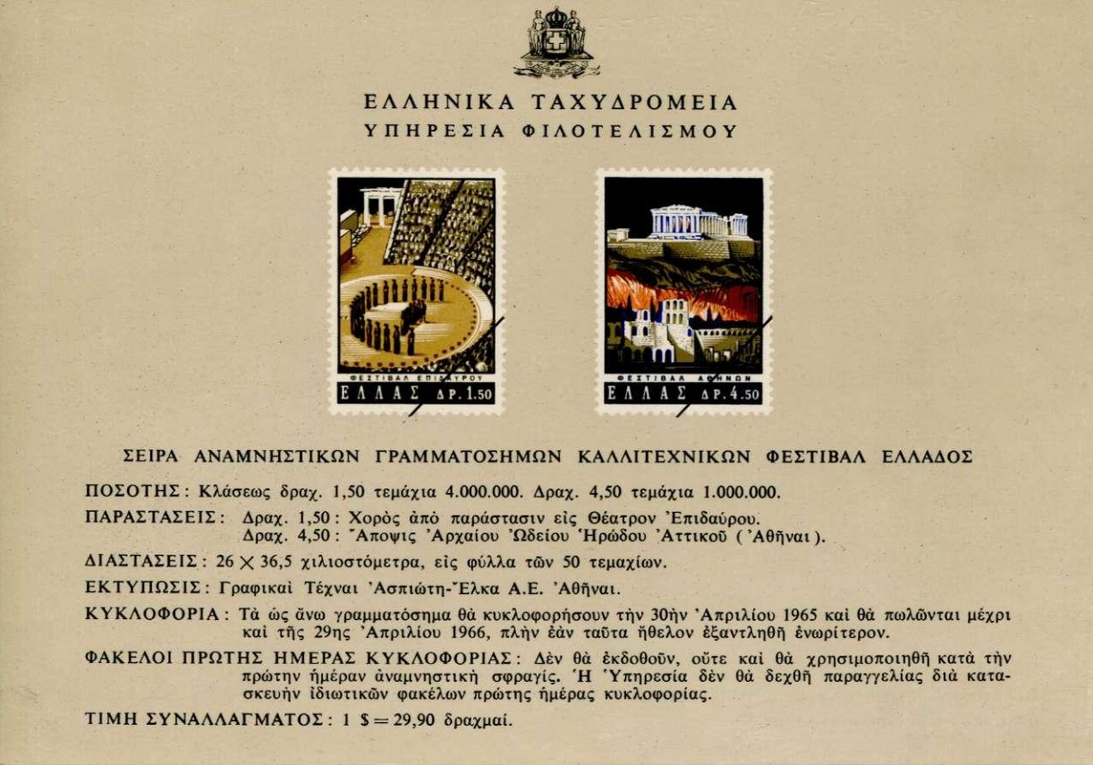 Ελληνικά Ταχυδρομεία, Ανακοίνωση Σειράς Αναμνηστικών Γραμματοσήμων Καλλιτεχνικών Φεστιβάλ Ελλάδος, Γραφικαί Τέχναι Ασπιώτη – Έλκα Α.Ε., Αθήναι, 30 Απριλίου 1965 έως 29 Απριλίου 1966.